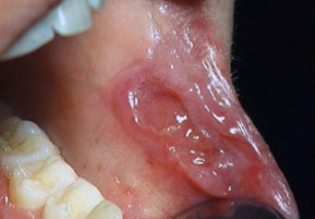 This patient had experienced major aphthous stomatitis outbreaks since she was a few years old. She was referred to a gastroenterologist for a suspected food allergy. The patient was diagnosed with an allergy to oats. After elimination of oats from her diet these large recurrent ulcerations with proliferative borders disappeared.